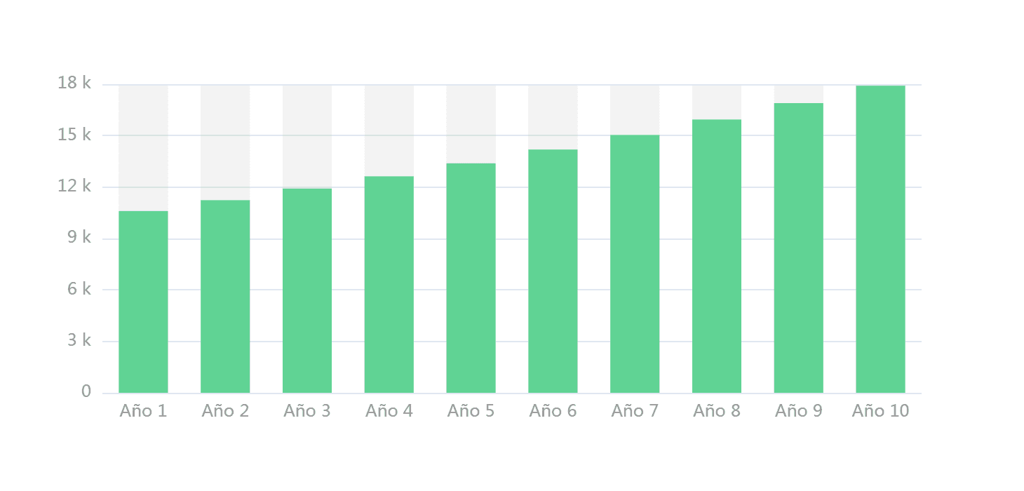 Después de 10 años, tu capital inicial de $10,000 habrá crecido a $17,908.48, generando un rendimiento del 79.08%. Si no hubieras reinvertido las ganancias con el interés compuesto, tendrías un 60% de rendimiento.