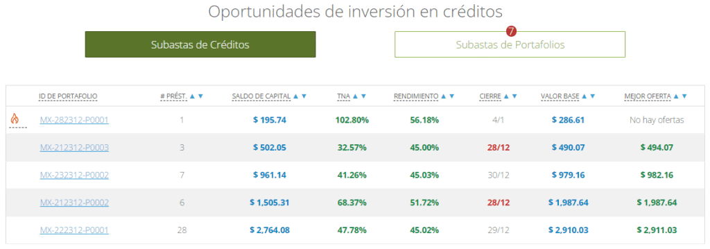En la imagen se aprecia la opción de portafolios, la cual revela las posiciones de inversión que otros inversionistas quieren vender dentro de la plataforma. Básicamente, es un mercado secundario para conseguir liquidez anticipada.