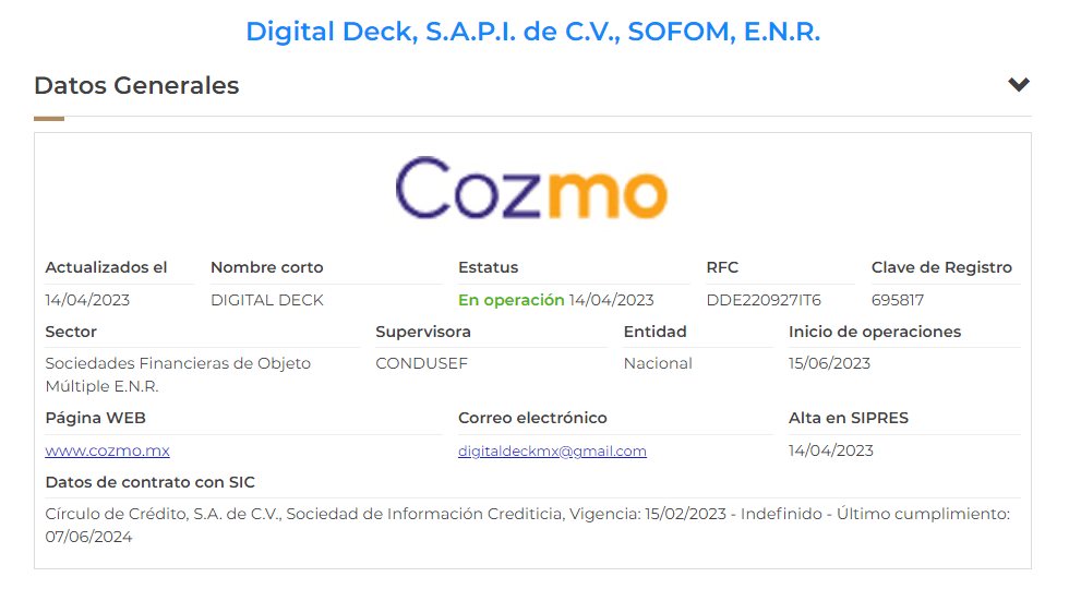El nombre de la empresa detrás de esta marca es Digital Deck, S.A.P.I. de C.V., SOFOM , E.N.R.; una empresa legal, supervisada y autorizada por las autoridades mexicanas.