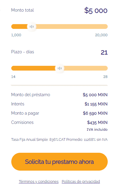 Desde $1,000 hasta $20,000 MXN a pagar en un plazo de 14 a 91 días.