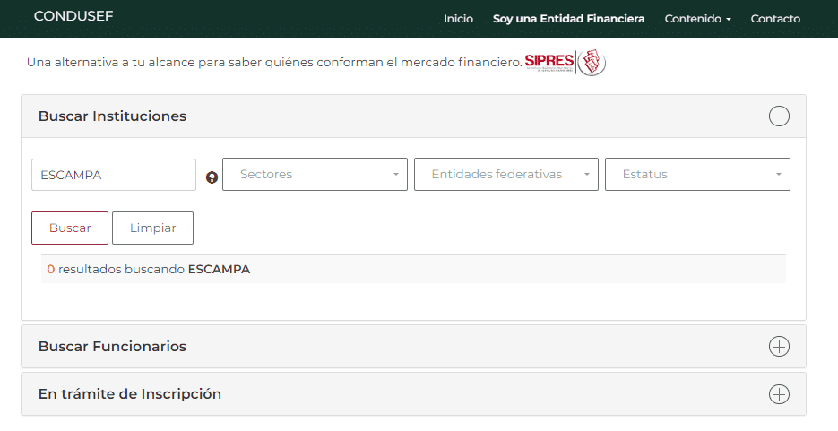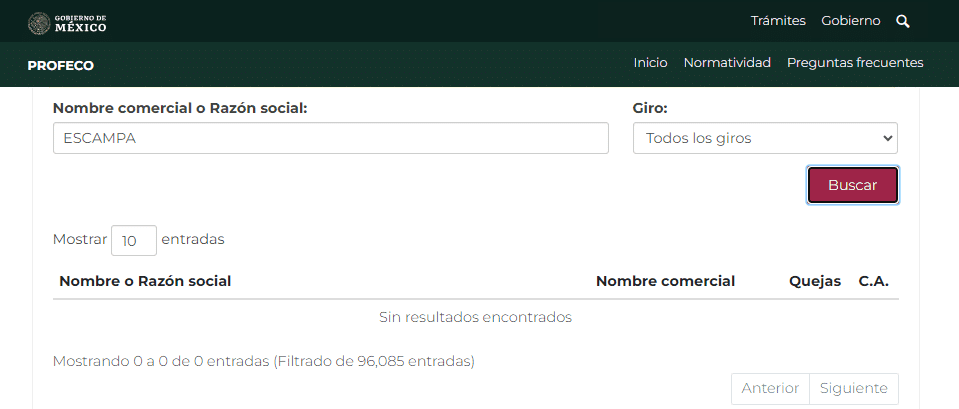 Otra opción para conocer si Escampa es legal son los registros del Buró Comercial de PROFECO, donde tampoco aparece registrado ningún contrato con dicho nombre comercial o razón social: