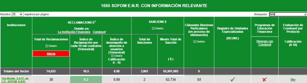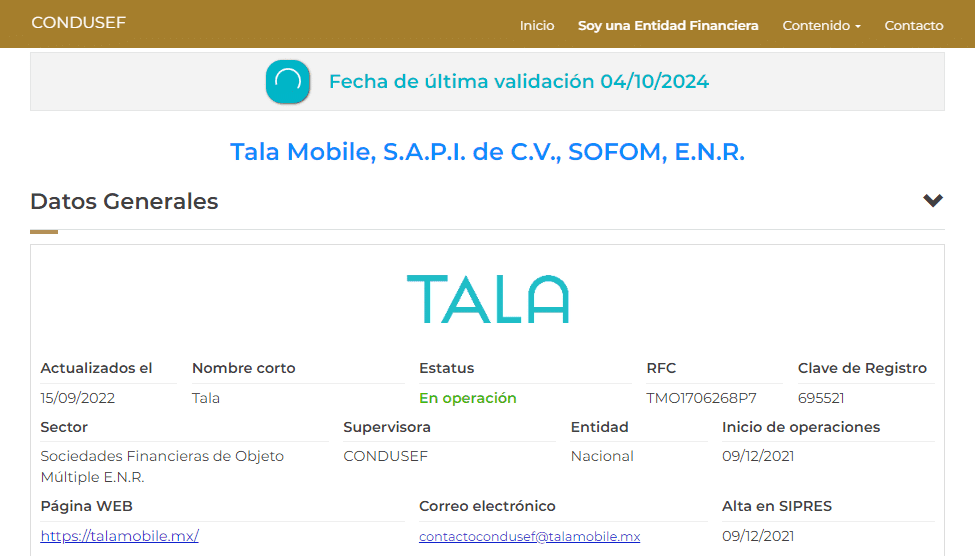 La empresa TALA MOBILE, S.A.P.I. DE C.V., SOFOM, ENR está registrada en la lista de financieras confiables de CONDUSEF, ante la cual tiene un índice de reclamaciones considerablemente bajo.