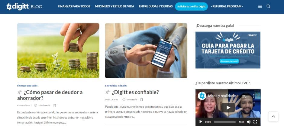 Destacado entre los sitios web de finanzas está el blog de Digitt, una empresa dedicada a transferir o eliminar las deudas de tarjetas de crédito. Como su producto está realmente ligado a la educación financiera, crearon un blog ideal para nutrirse en temas como de deudas, ingresos y créditos.