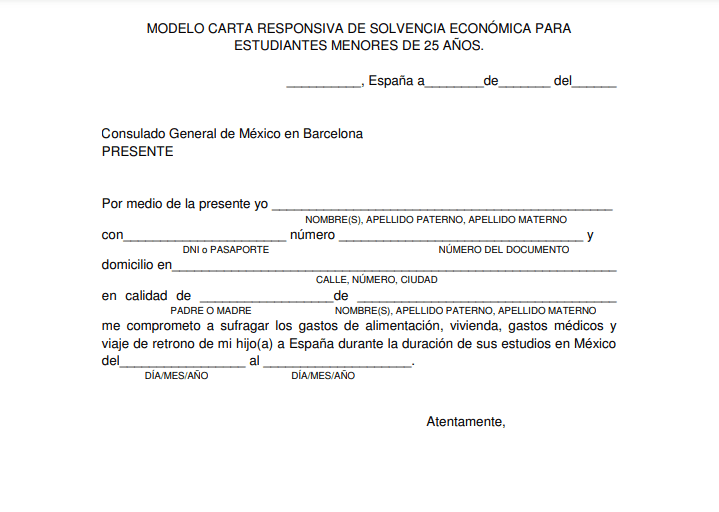 Este es el ejemplo de una carta de solvencia que promueve el Consulado General de México en Barcelona para estudiantes menores de 25 años en España: