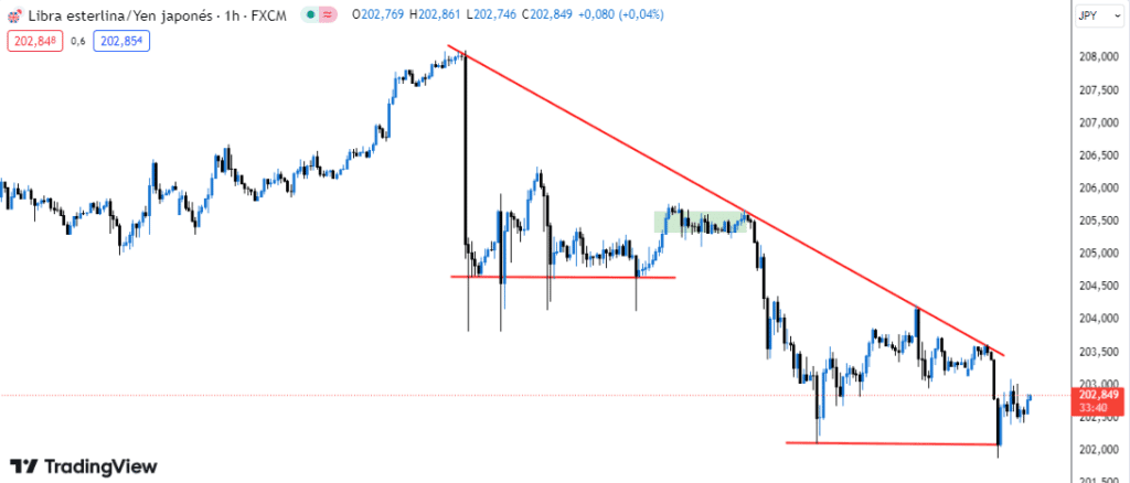 La línea amarilla marca el precio de entrada, la roja marca el precio límite establecido para tolerar pérdidas y la línea verde marca el precio de cotización de posibles ganancias.