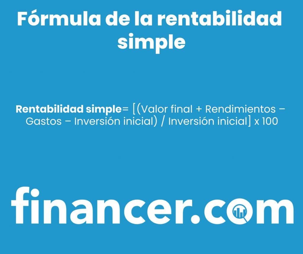 La fórmula de la rentabilidad simple es: Rentabilidad simple= [(Valor final + Rendimientos – Gastos – Inversión inicial) / Inversión inicial] x 100