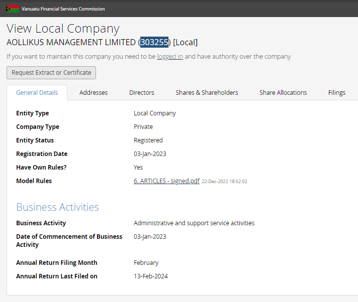 Las empresas detrás de este corredor son Aollikus Limited y Saledo Global LLC, registrada respectivamente en la República de Vabuatu y en San Vicente y las Granadinas.