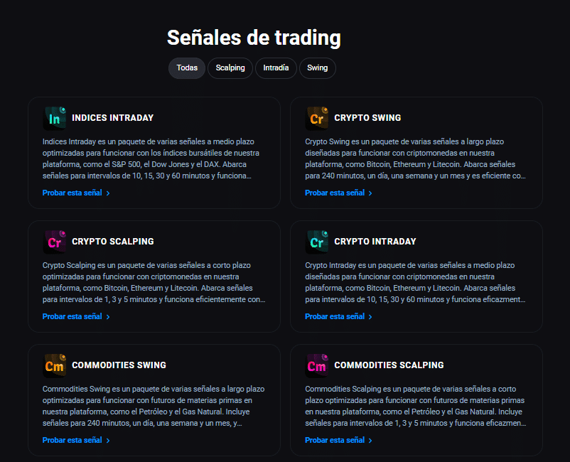 Estas alertas están basadas en análisis técnico y fundamental de activos en diversos mercados. Se dividen según la temporalidad (scalping, intradía y swing), pero además según el tipo de activo y otras variables.
