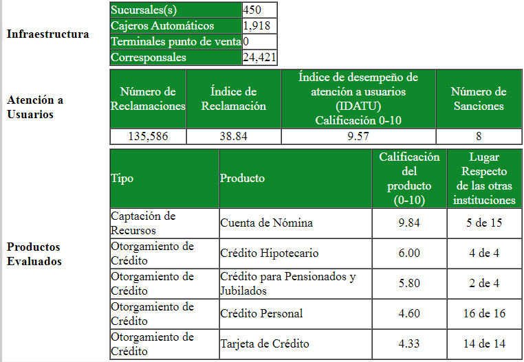Como puedes ver, la cuenta nómina y el crédito hipotecario son sus productos más destacados. Además, a pesar de tener un importante número de reclamaciones, su Índice de desempeño de atención a usuarios está entre los mejores. Lo qué significa que es un banco que se preocupa por sus clientes.