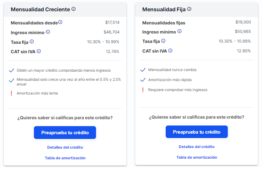 Aquí tienes una comparativa para una vivienda por un valor de $1,500,000 MXN, con $200,000 de enganche y un crédito total por $1,300,000 hecha en el propio simulador de Smart Lending.