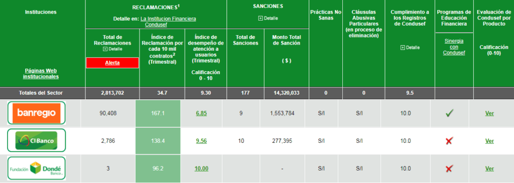 En el caso de las entidades bancarias, puedes ver su calificación en los diversos productos que ofrecen. También puedes ver el Índice de desempeño de atención a usuarios trimestral e incluso el SIPRES si haces clic en el logo o el nombre de la entidad.