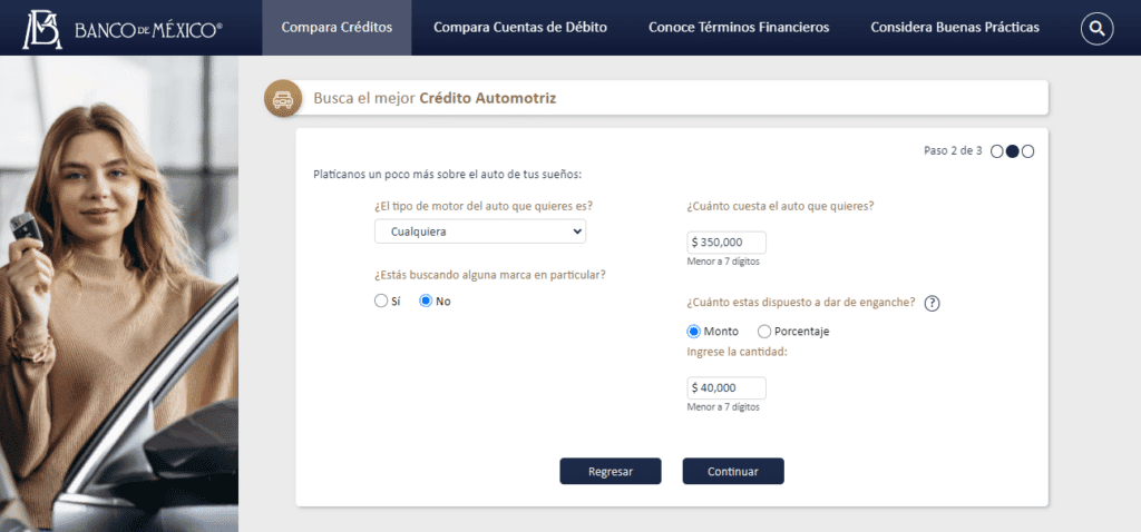 En la liga verás diversos campos que deberás llenar con tu edad, ingresos, costo del vehículo, la cantidad o porcentaje de enganche que puedes dar y entonces verás diversos relatados, desde la opción más económica hasta la más costosa.