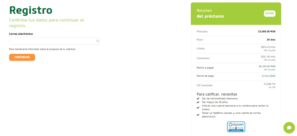 El monto del préstamo es de $400 a $2,000 pesos para clientes nuevos, mientras que el plazo de devolución es de 1 a 30 días para nuevos clientes. La tasa fija anual simple es del 435.60%.