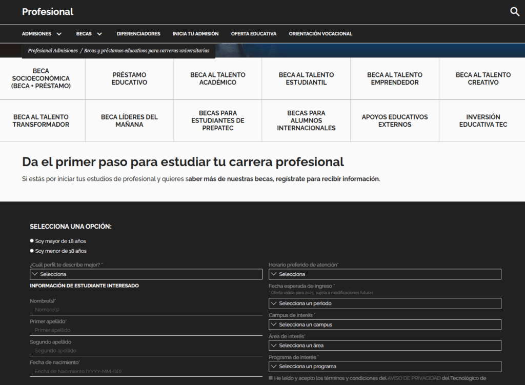 La mayoría de las universidades e instituciones tienen en su web una sección de información que muestra las becas de educación superior propias, así como las instituciones de financiamiento con las que tienen una colaboración. Por ejemplo, así se ve la sección de becas del Tecnológico de Monterrey: